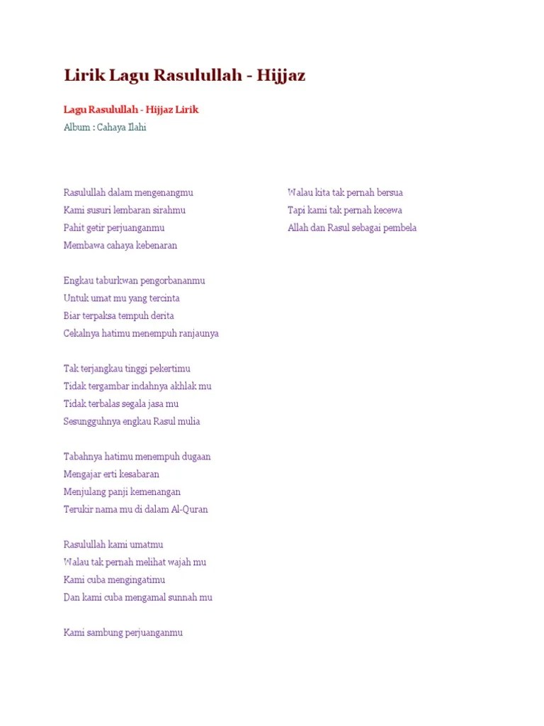 Chordify is your #1 platform for chords. Rasulullah adalah lagu religi yang dipopulerkan oleh grup nasyid asal malaysia, yakni hijjaz. Hijjaz, lyrics :rasulullah dalam mengenangmu kami susuri lembaran sirahmu pahit getir perjuanganmu membawa cahaya kebenaran engkau taburkan .